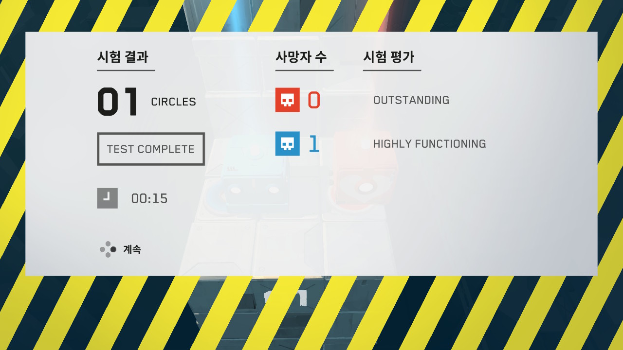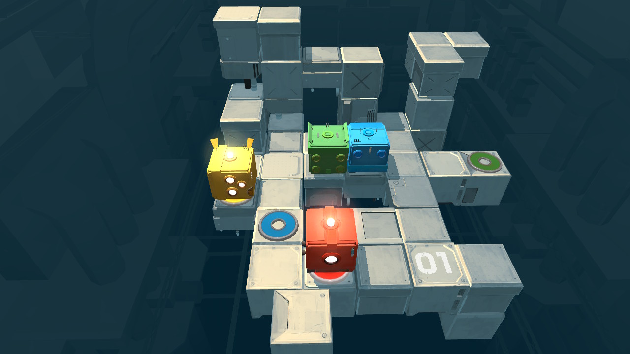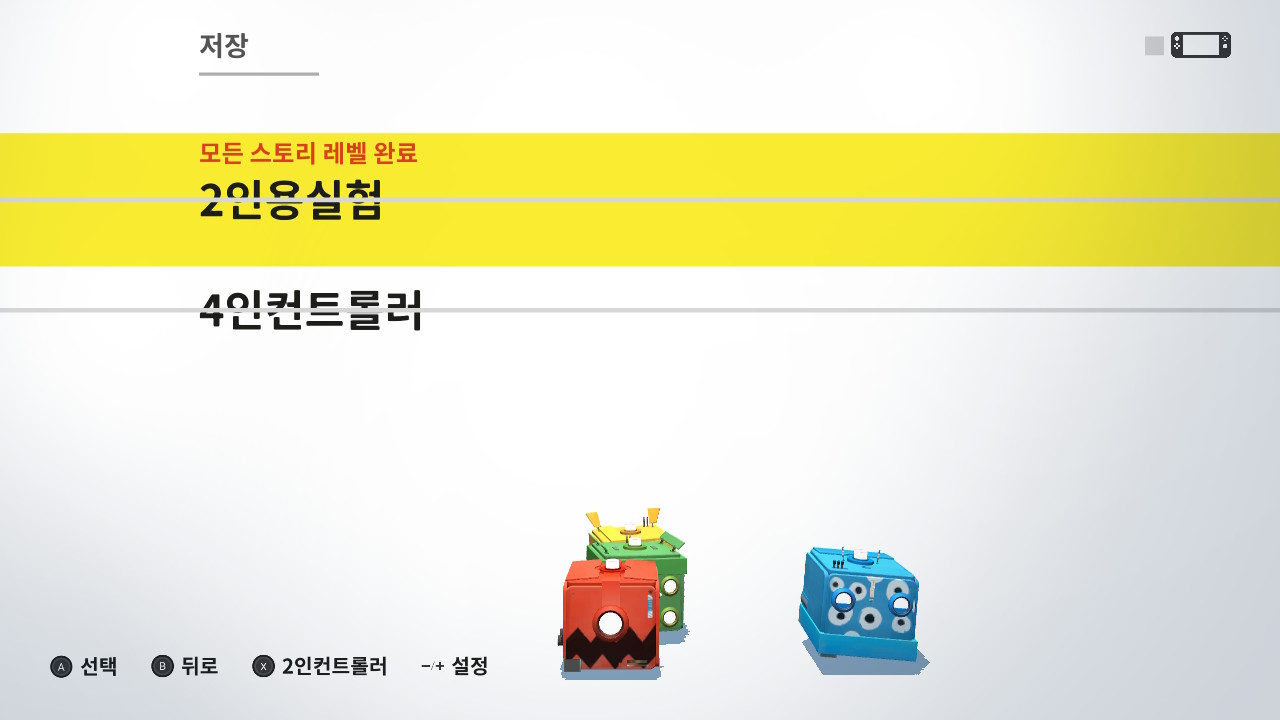 스토리 모드의 스테이지 1 화면입니다. 두 명의 플레이어가 각자 협력하여 캐릭터 색상과 맞는 원형판으로 캐릭터를 이동하면 스테이지 클리어입니다.