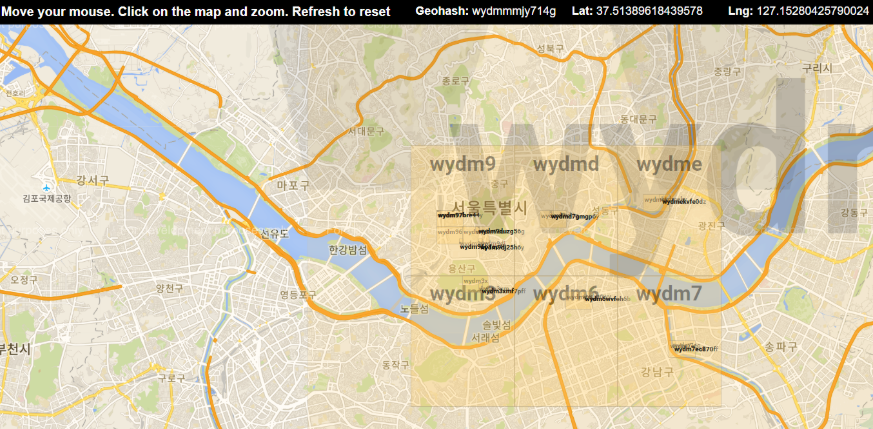 - 세계 지도를 세로로 한번 양분하고 다시 가로로 양분하는 작업을 반복하면서 각 영역의 식별자를 0과 1로 연결해서 GeoHash 코드값을 생성하는 방식